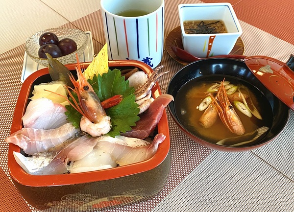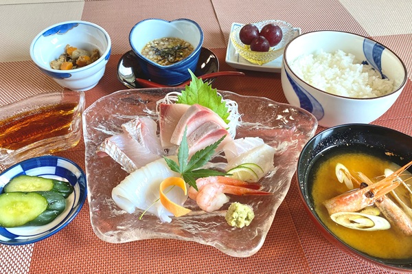 刺身、むきそば、ごはん、小鉢、おしんこ、えび汁、フルーツ