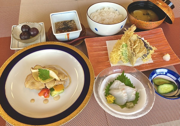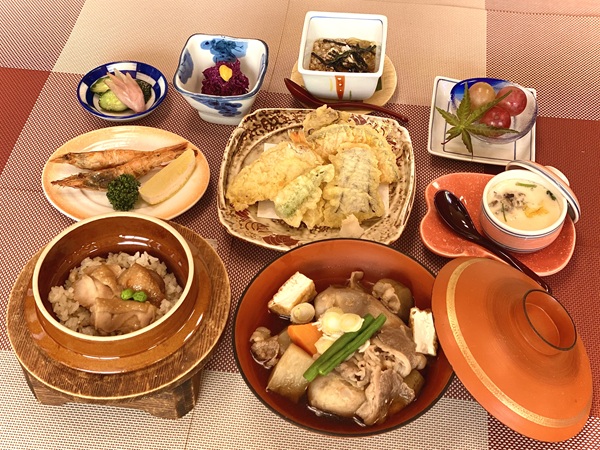 炊き込みご飯、山形の芋煮、もって菊、地魚と秋野菜の天ぷら、がさえび焼き、むきそば、茶碗蒸しなど