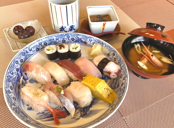 武蔵特製 にぎり寿し、むきそば、えび汁、フルーツ